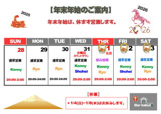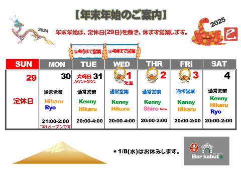 年末年始は、29日(日)を除き休まず営業します。大晦日と元旦は、4時まで営業します。
