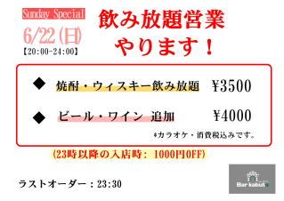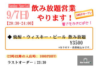 ●9/7(日)飲み放題営業します!